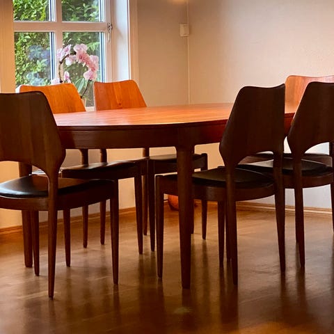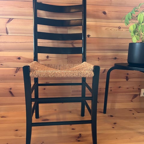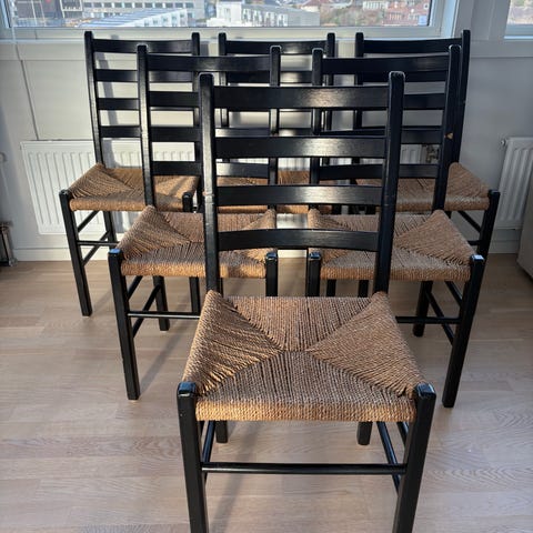 2 spisestuestoler med armlen. Stolene er malt svarte. Pris er per stk.