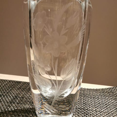 Håndlaget krystallvase fra kjente merkevare Magnor Norge (1896, https://www.magnor.no/produkter/?wpf_filter_cat_list_0=10311%7C10361%7C10369%7C10371%7C10373%7C10375%7C10365%7C10359%7C10367%7C10573%7C10363%7C10357)