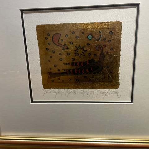 Trykk av Dom Mingolla abstrakt, 55x70 cm i messing ramme og glass.