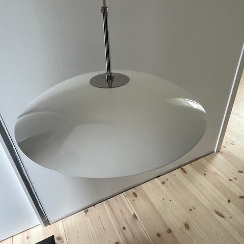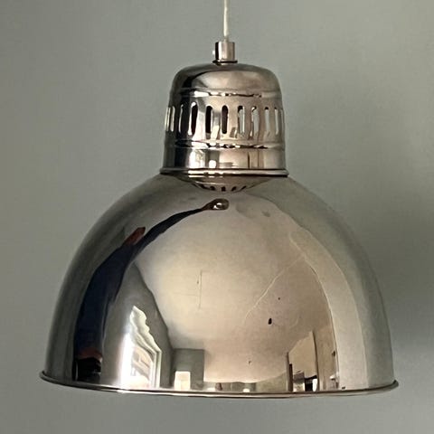 Shirin pendel/taklampe i sølvfarge fra Høvik Lys, kjøpt på Christiania Belysning våren 2018. Lampen er en del av Lysaker-serien, og er ikke lenger å få tak i fra Høvik Lys. Den trenger nye skruer i sokkelen da de som fulgte med ikke var av den beste kvaliteten, og gjengene på skruene ble ødelagt allerede da vi opprinnelig skrudde den opp. Nypris var 2.998,-.