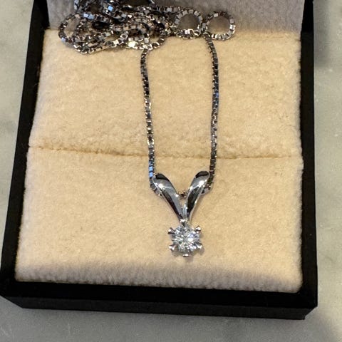 Enstens diamantring i hvitt gull selges. Meget pen, 6klør. Har ikke diamantsertifikat, dessverre. Arvet etter mor. Tror stenen kan være ca. 0.15. Kjenner ikke klarhet.
