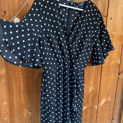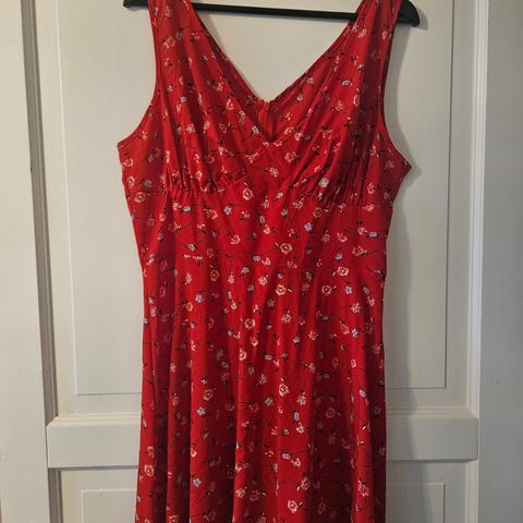 Supersøt og myk polkadot-kjole i en fin rødfarge. Kjolen er smal i livet, og litt løsere i skjørtet. Den er lite brukt, og er størrelse L. Materiale: 95% bomull, 5% elastan. Jeg sender stort sett alltid første virkedag etter mottatt penger for frakt :)