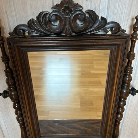 Antikk sofa med trestruktur og stofftrekk. Sofaen har dekorative utskjæringer i tre og en buet rygg. Egnet for bruk i stue eller oppholdsrom.