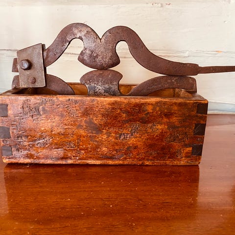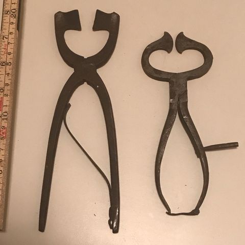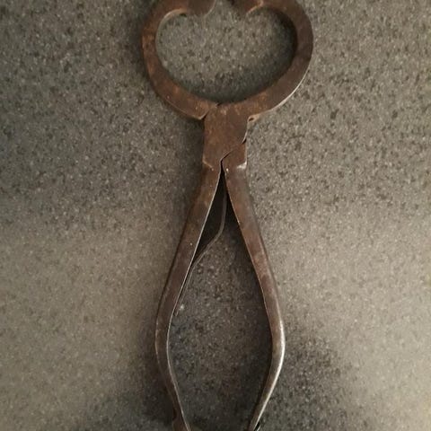 Gammel, alder ikke kjent, sukkersaks, kandissaks for kasse. Hjemmesmidd med dreid trehåndtak.