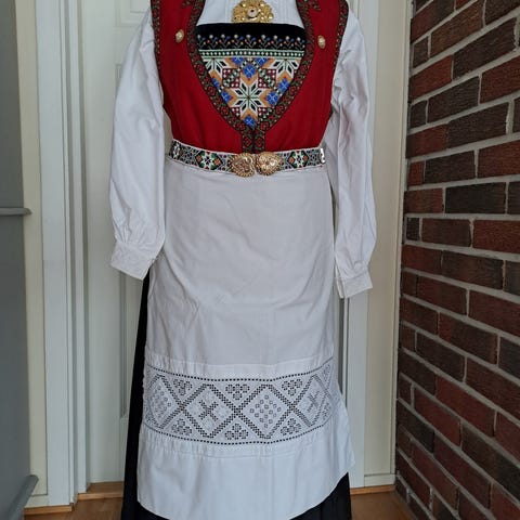 En liten barnebunad kan brukes i alderen 3 til ca 8 år. pris kr 8500. Lages på mål, til å vokse I.