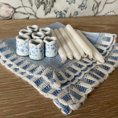 28cm høy. Blå, hvit, gull. Tre armer. Til 4 lys. Bittelite nagg på ene armen ( bilde 3 ). Håndmalt. Tysk. Kjøper betaler porto.
