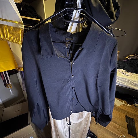 Sort bluse langermet med rysjekant. Made in Italy. Kjøpt på Sicilia. Brystbredde 48cm, livvidde 42 cm, lengde 62cm.