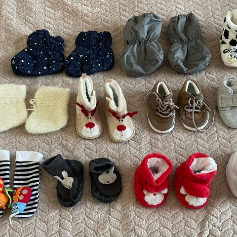 - nr 18: Brune, mye sokker (til å ha i vognen eller sengen) med 7,5 cm høye ankler (så de sitter bedre). Ca str 16-18 (ca 10,5 cm lang undersåle). Antiskli prikker under.