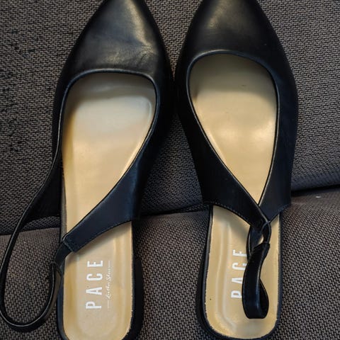 Skoene har et sort silkelignende stoff med åpen hæl med stropp. Stroppen består av en del elastikk for bedre passform. Stroppen er videre dekortert med en sort silkelignende sløyfe i samme material som skoen. Sløyfene har sølvfargede metalldekorasjoner. Sålen har polstring for økt velbehag. Kjøpt i London. Selges med et tungt hjerte da de er for små.