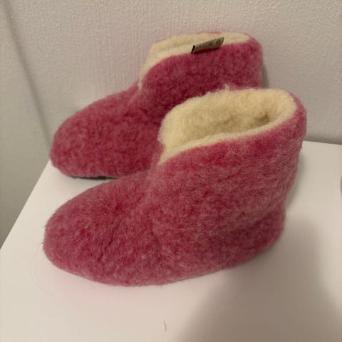 Tova tøfler. Håndstrikket.str 7-8 år. 20 cm , med skinnsåle fra Sandnes garn.