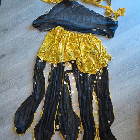 Magedansdrakt str. 38 komplett drakt med .skjørt..belte.armbelter.hodeplagg.og tørkle.. Rød med paljetter og perler. Hånd gjort.. Kjøpt i Tyrkia.