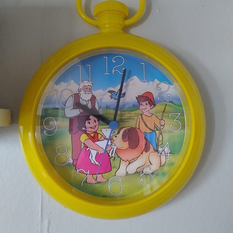 Keramisk figur, gutt / jente , pluss klokke. Figuren har bevegelig hodet. Guttehodet kan byttes med et jentehode. Klokken bruker ett AA batteriet.