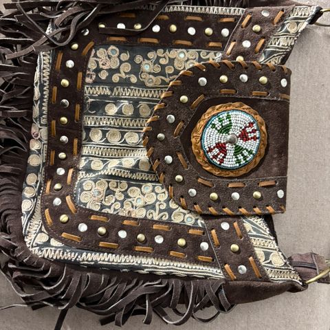 Unik Veske Håndlaget av Kunstner på Ibiza . Med Kroko/Slange skinn . Pels Detalj. I Ypperlig stand . Den er Ca. 30 År Gammel og finnes kun i 1. Eksemplar .. Skulder Rem og Ett stort rom , ett mindre rom under lokket . På Baksiden er det ett rom med ett lite folder rom . ( Se Foto ) . Mål: B - 38 cm. H - 29 cm. Målt utvendig !!. Lengde på Rem er 50 cm . Da målt fra ytterste hullet . Hullene er forsterket i metall . Slangeskinn på lokket , under , bak og på skulderhviler på Rem. Alle sømmer er Håndsydde . Vesken blir så lite brukt , derfor selger jeg den !! Kan sendes på kjøpers regning. Hentes i Oslo e., Avtale . Pris er fast !!!. Se mine andre Annonser . Sendes med Posten . Forsikret med Sporing . Bruker ikke fiks ferdig . Vips. Posten .