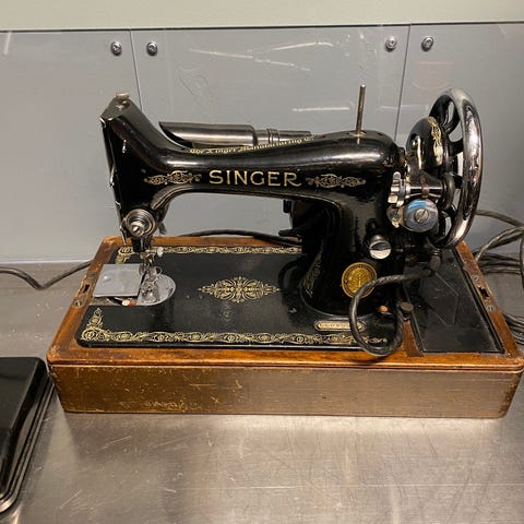 Selger en gammel symaskin. Det er en gammel Singer symaskin.