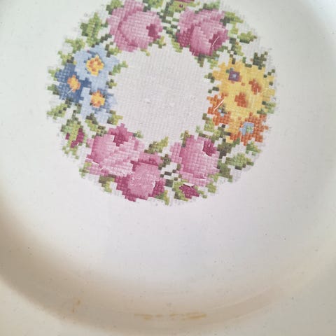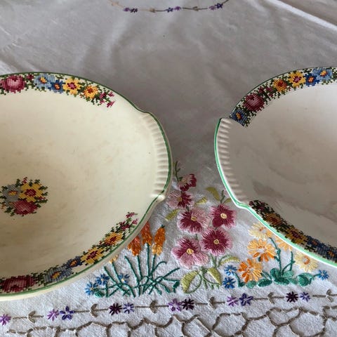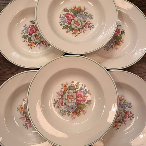 Én terrin, tre fat og to boller selges samlet. Nusselig, men noe slitt mønster, se bilder.