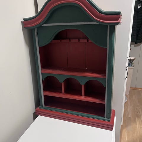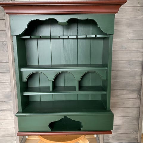 Vegg hylleseksjon i hytte stil og grønn farge 65 cm bred x 75 cm høy til salgs. Ubrukt.