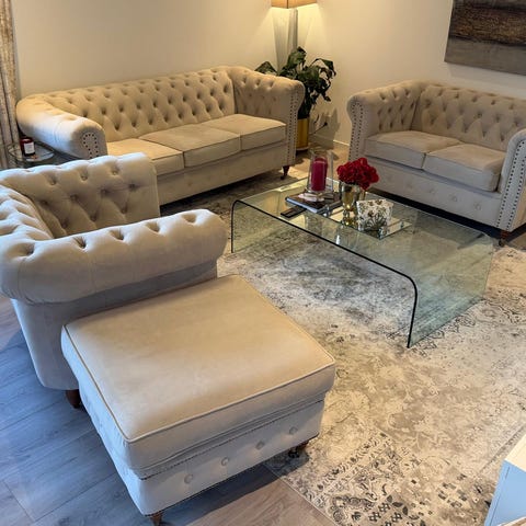 Kan kjøpes med fotpall og puff.