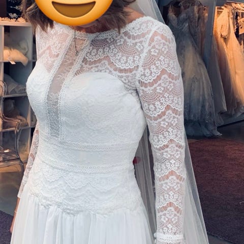 Kjolen ble renset etter bryllupet og det finnes ingen tegn på at den er brukt. Kjolen er sydd noe inn i livet og opp på lengden, så det er fullt mulig å gjøre justeringer slik at det sitter helt som den skal. Jeg er selv 176cm høy og benyttet 7cm hæler på brudeskoene.