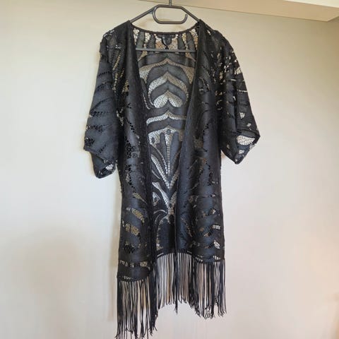 Nydelig kimono fra H&M, svart mesh-stoff brodert med gullfargede blomster.