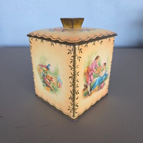 Fantastisk flott dekorert metall skrin. Dekket av emalje i nydelige farger og mønster. Får litt Rococo feeling Rett og slett en liten ‘’ juvel’’ Tror det er ekte gullbelagt inni og kanten er Siselert med gammeldags mønster. Knepplukningen virker fint. Dessverre har det fått en skade på lokket.... er nok mulig å reparere men sannsynligvis kostbart! Selges derfor rimelig 950.- ca 6x5x3,5 cm.