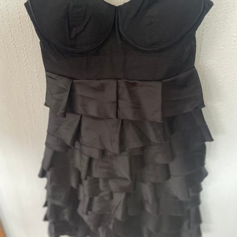 Kjolen er ermeløs og har brede horisontale striper i svart og hvitt. Overdelen har mørk kontrastfarge med avrundet hals. Baksiden har lys hovedfarge med mørk øvre del. Lengden er over kneet, og passformen er tettsittende. Egnet som festkjole eller til andre anledninger der man ønsker en enkel, men tøff kjole.