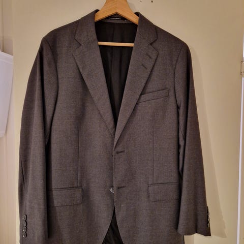 Utrolig flott Italiensk dress med vest, som jeg har brukt et par ganger. Det kan ingen se. 1 nydelig slips som passer perfekt følger med. Kostet mellom 7-9000. Str 50. Jeg er 176, 83 kg. Fargen er mørk grå.