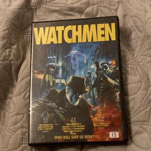 Søkeord: #Filmer #SiljesDVD Serie Serier Series Movie Movies Film Filmer DVD DVDer Video Videofilm Videofilmer Rorscharc Comedian Nightowl Silk Spectre Graphic Novel Grafisk Novelle Superhelt Superhelter Super Helt Hero Heroes Superhero DC Comics Simon Garfunkel Halleluja Action Actionmovie Cape Kappe Alan Moore