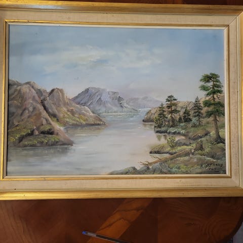 Maleri, malt ca. 1974, av en bjørk ved en foss på Sunnmøre, selges med ramme. Motivet er malt på lerret og spent opp på en blindramme. Den ytre rammen er en solid, pen treramme med gull og svart pyntekant. Den er også fra 1970-tallet, er i beste kvalitet fra rammefabrikken i Levanger, den ble satt på da maleriet var ferdig malt, se bilder. Ytre mål på rammen: ca. 63 x 74 cm. Størrelse på maleriet: ca. 53 x 65 cm. Kan sendes godt emballert som pakke i Posten.