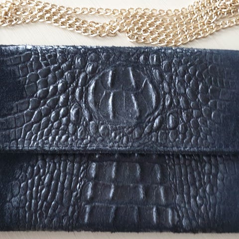 Den er laget i ett velur lignende stoff og i blå tone. Gull lenke i front. Gull farget glidelås, med dekorativ dusk, øverst. 4 lommer til kredittkort på innsiden.