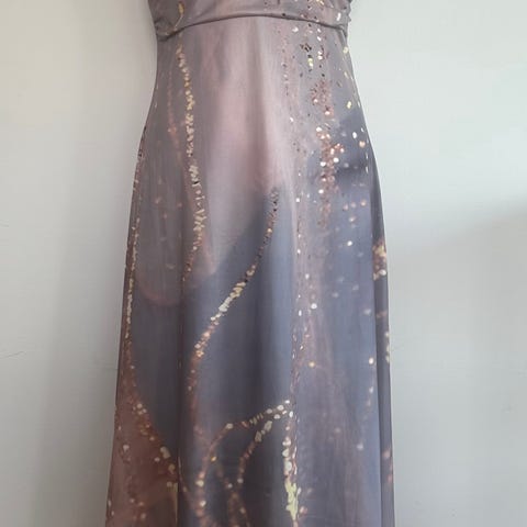 Lekker lang kjole i flotte farger. Tynn men foret. Meget pen. 100% viskose. Glidelås bak. Lengde fra overkant skulder til skjørtekant ca 123 cm. Omkrets under armer ca 95 cm, liv ca 80 cm. Billigste porto. Se også mine øvrige annonser (trykk på min profil for å se annonsene).