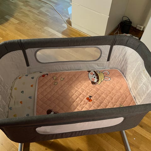 Kjempe fint babynest som du kan bruke begge veier:)den er beige på ene sida og blå på andre sida.Hører med et lite pledd og en liten pute:)