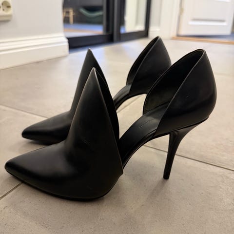 De fineste Alexander Wang high heels i skinn, kun brukt 1 gang, ser helt ubrukte og nye ut. Str. 38,5. Frage: svart. Ny pris: 6700 kr, støvpose medfølger. Selger de for: 2500kr Kan også sendes med posten. Sender gjerne mot at kjøper betaler for frakt.