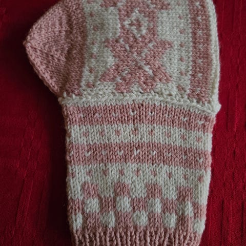Nystrikket "overtrekksdress" til rund opptenningsbrikettboks. Håndstrikket. Beholderen medfølger ikke. Diameter beholder: 12 cm. Høyde 23 cm.