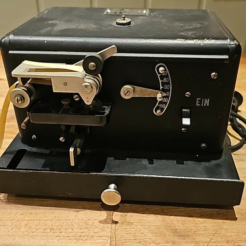 Hugin tippekupongmaskin nr. 1. Ukjent alder. Ukjent kommisjonær. Skuffe med nøkkel; åpner som den skal via knapp / innvendig mynt/seddelskuffe. Merket med Norsk Tipping-emblem. Pålimt lapp med systemkombinasjoner. Telleverk viser 26974. (Kr. 2500,-)