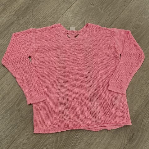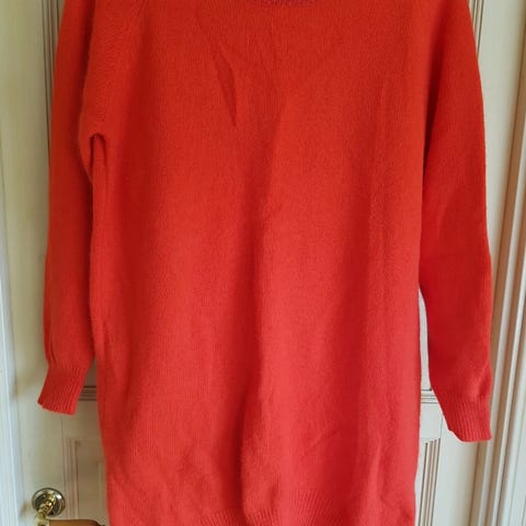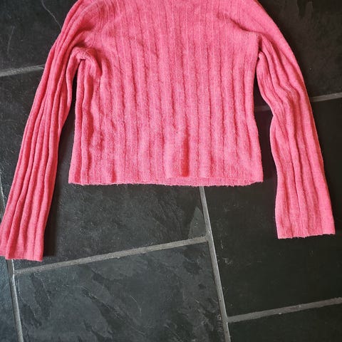 Brukt 1-2 ganger, ellers god som ny. Strikkegenser i fargen peach(litt lysere enn på bilde, fikk det ikke helt frem) str 36. Strikkegenseren er lang bak.