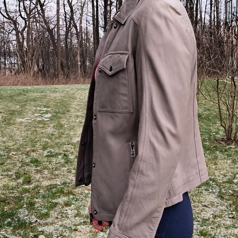 Står str. 40 på jakka, men er mer en str. 36. Jakka er aldri brukt og er i mykt skinn. Tror det er kalveskinn