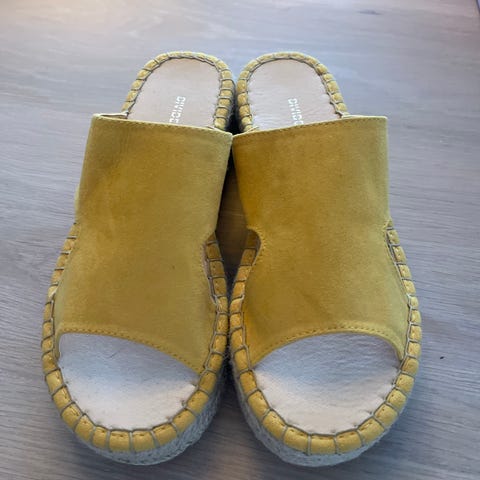 JULEGAVE. Str.39. NYE LÆR / SKINN FLIP FLOPS / SLIPPERS. Sennepsgul.