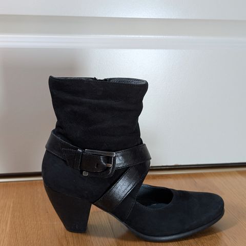 Pent brukte skoletter i semsket sort skinn fra Via Vai i størrelse 37 (normal i størrelsen). Det følger med 2 sett med skolisser, ett i grønt og ett i brunt. Veldig god kvalitet, kun litt slitasje under sålen. Ordinær pris var rundt 1600 kroner.