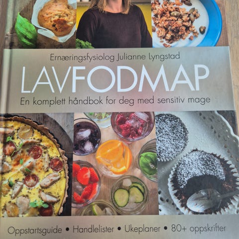 Julianne Lyngstad: Lavfodmat - En komplett håndbok for deg med sensitiv mage, Jungelboken Forlag, Oslo 2015. 1.utgave, 2. opplag. 225 + 6 sider. Pen bok. (Kr. 125,-)