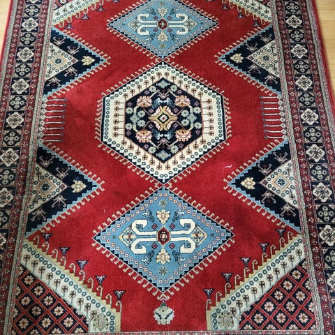Ekte Persisk teppe i ull, størrelse 270x150cm. Har bare vært brukt i stua,ikke spist mat der. Har Sertifikat fra butikken der det er kjøpt.Kjøper henter el bet.frakt. Selges for 12.000kr