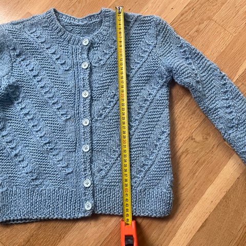 Kjempe arbeid på denne guttejakka i ullgarn. Målene er 49 total høyde, armen er 35 cm og vidde er 40 cm! Er usikkerpå størrelse det er så se målene!