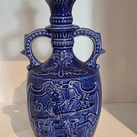 Lekker karaffel med med kløver, spar, hjerter og ruter i "gull". 22cm høy. "Sotfarget" glass. Uten skader. Rommer 6dl. Må hentes i Asker eller sendes mot tillegg for frakt.