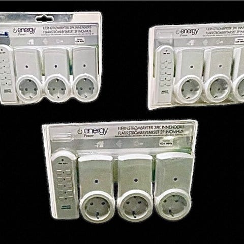 Uåpent. Inneholder 3 strømbrytere med fjernkontroll. Batteri er inkludert.