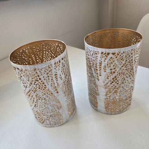 Dekorative te-lysestaker - hullmønster som har fin effekt med tente te-lys. Kr 25,- pr stk