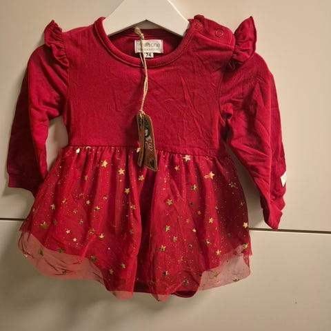 Fint antrekk til julekortbilde eller nissefest. Kjole, lue og strømpebukse. Str 12-18 mnd men litt liten i str.