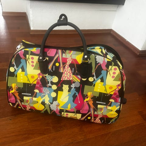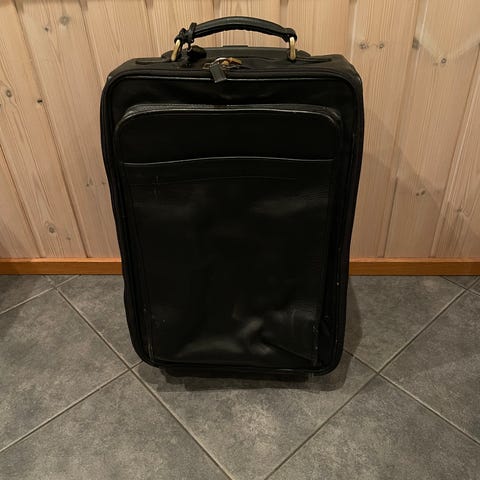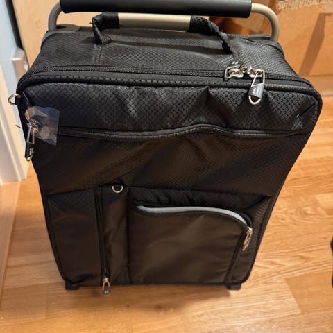 Mørk blå m beige detaljer, slitesterkt stoff og mange lommer og detaljer. Veldig lett.