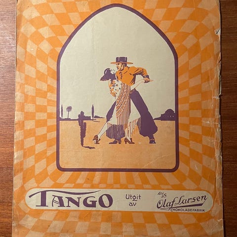 "Paa baksiden finder De et par linjer av refrainet til 2 nye foxtrotter av "Gummans" Komponist Jules Sylvain: "Undskyld, hvad var navnet?" og "Tutta!"