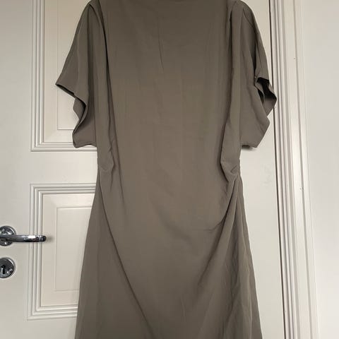 Kjempefin kjole fra Tiger of Sweden i størrelse 40 (fargen er en gråbrun tone med veldig fin glans i stoffet-tror den kalles muldvarp/greige). Omkrets bryst er 100 cm, livvidde 86 cm (målt uten å tøye stoffet) og lengde 88 cm. Klassisk modell som når ned til knærne, en brystlomme med knappelukking og strikk i ryggen som gjør at den sitter fint på. Knepping hele veien ned i front. Laget av 100% polyester. Pent og lite brukt, ingen flekker eller skader.