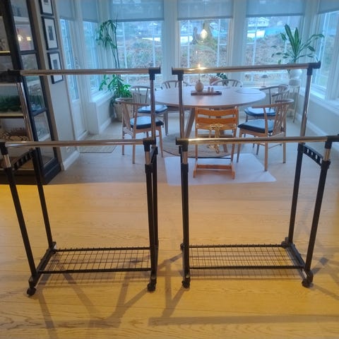 Dette allsidige klesstativet, inkludert 2 stk, vil gi en umiddelbar praktisk og bærbar lagringsløsning for dine klær. Laget av høykvalitets rustfritt stål, er dette tørkestativsettet holdbart for mange års bruk. Rammen kan utvides opp til 150 cm, og stativet er designet for å maksimere tørkeplass mens du bruker minimalt med stående plass. Høyden kan justeres fra 108 cm til 170 cm. Den robuste nederste hyllen brukes til å tørke eller oppbevare sko. Stativet kan flyttes rundt enkelt takket være 360-graders svinghjul. To av hjulene er utstyrt med bremser, og legger til ekstra stabilitet. Dessuten er det lett å montere og vedlikeholde. Det kan også demonteres for enkel oppbevaring.