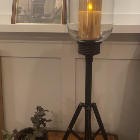 Selges en ubrukt store stormlykt / lysstake for kubbelys i glass og metal. Lysstake er i rustoptikk og kan bli brukt ute også. Stake selges uten kubbelys.